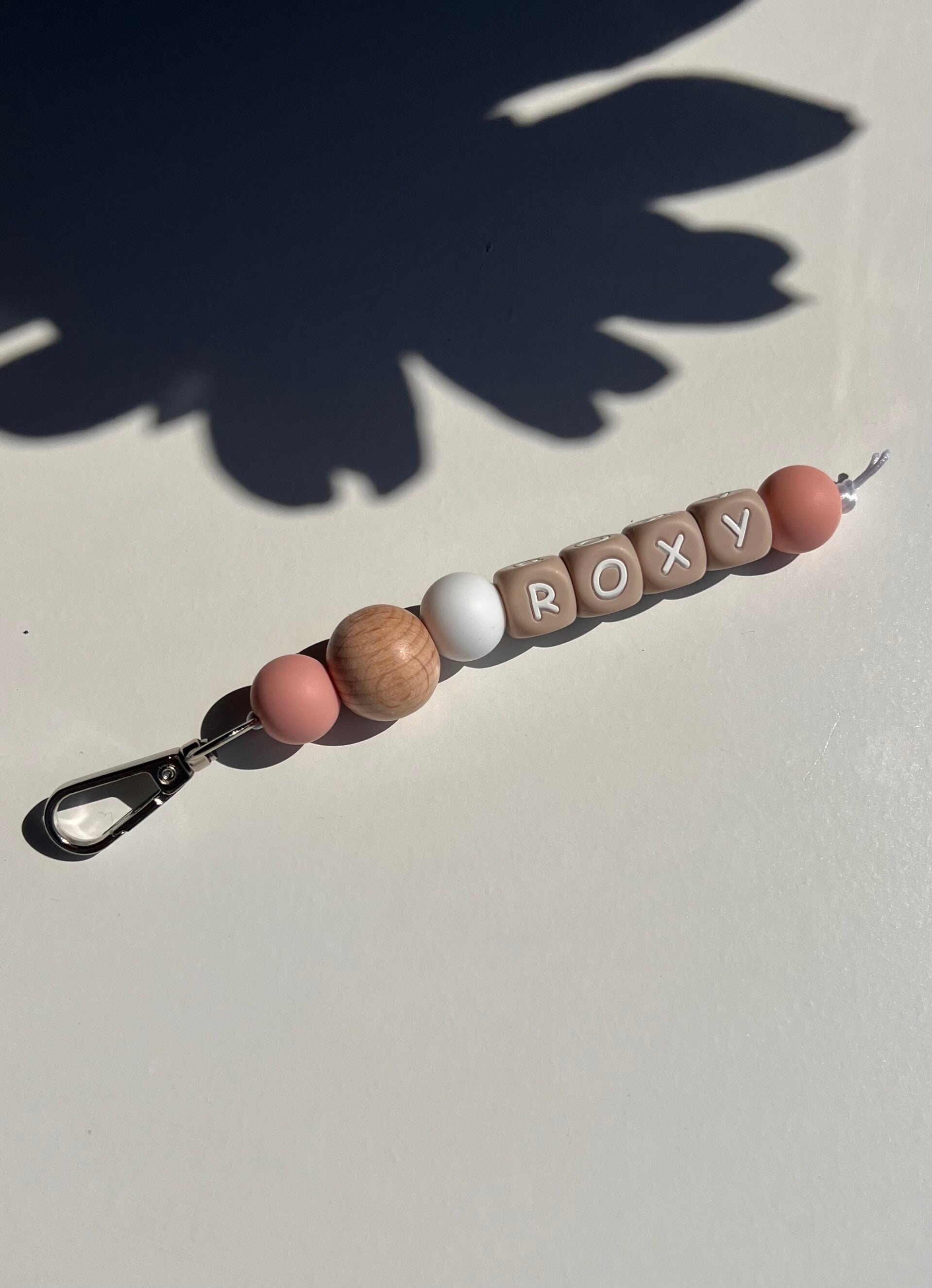 - Deze koord met naam is handgemaakt van een mooie kwaliteit satijnkoord, siliconen kralen en een houten clip.