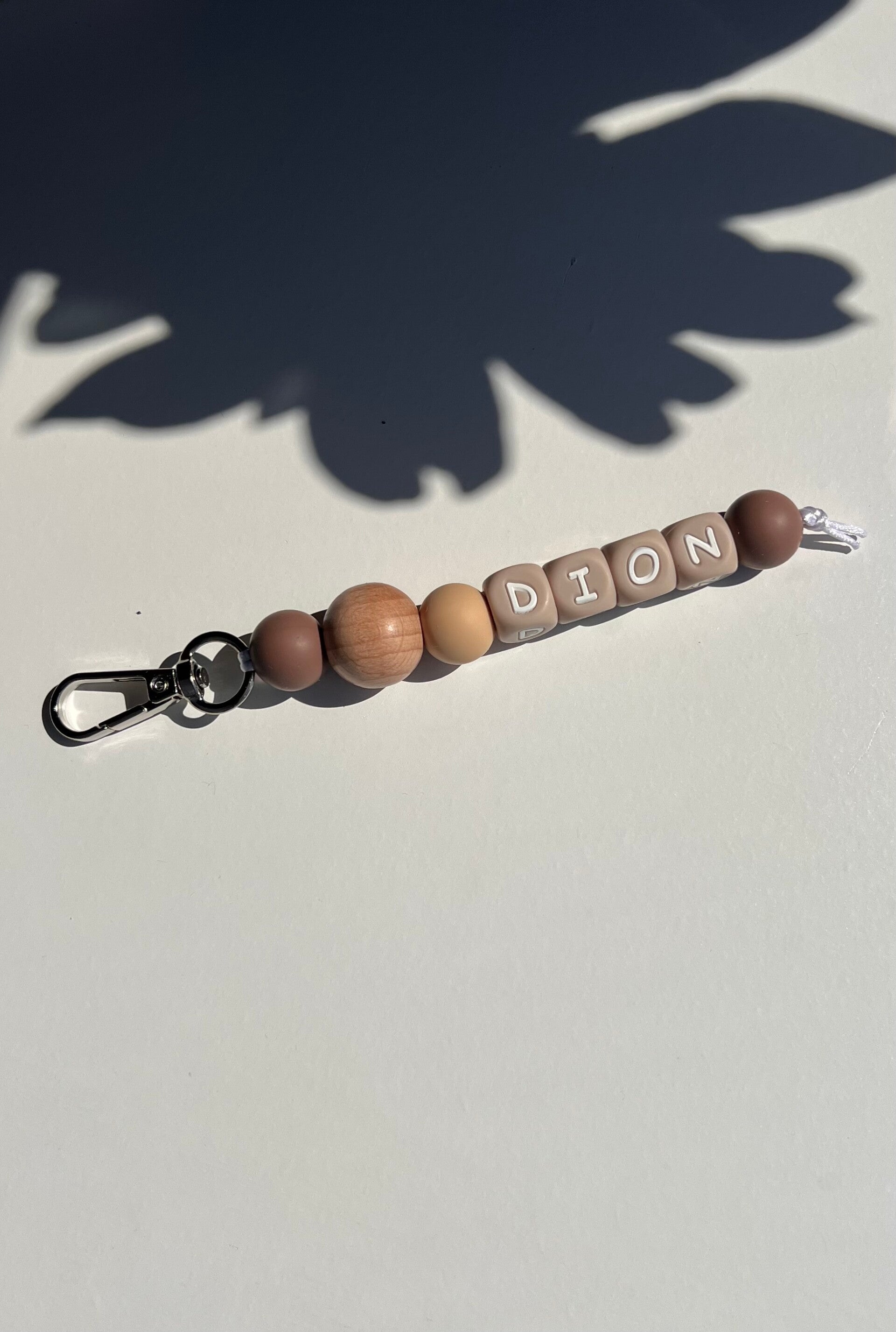 - Deze koord met naam is handgemaakt van een mooie kwaliteit satijnkoord, siliconen kralen en een houten clip.