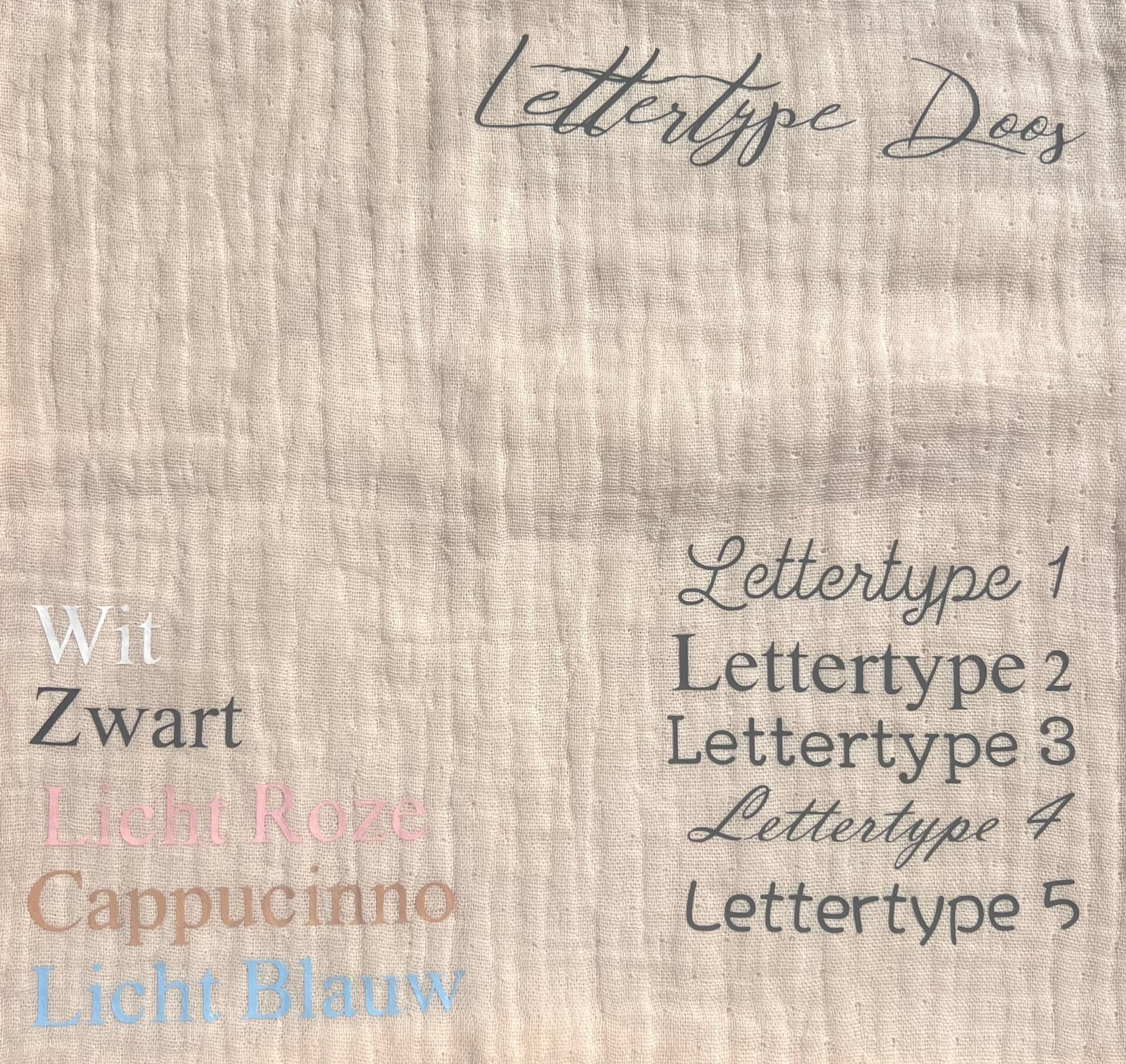 *Lettertype van de doos is een vast lettertype. Voor de producten kan je de lettertype wel zelf uitkiezen.